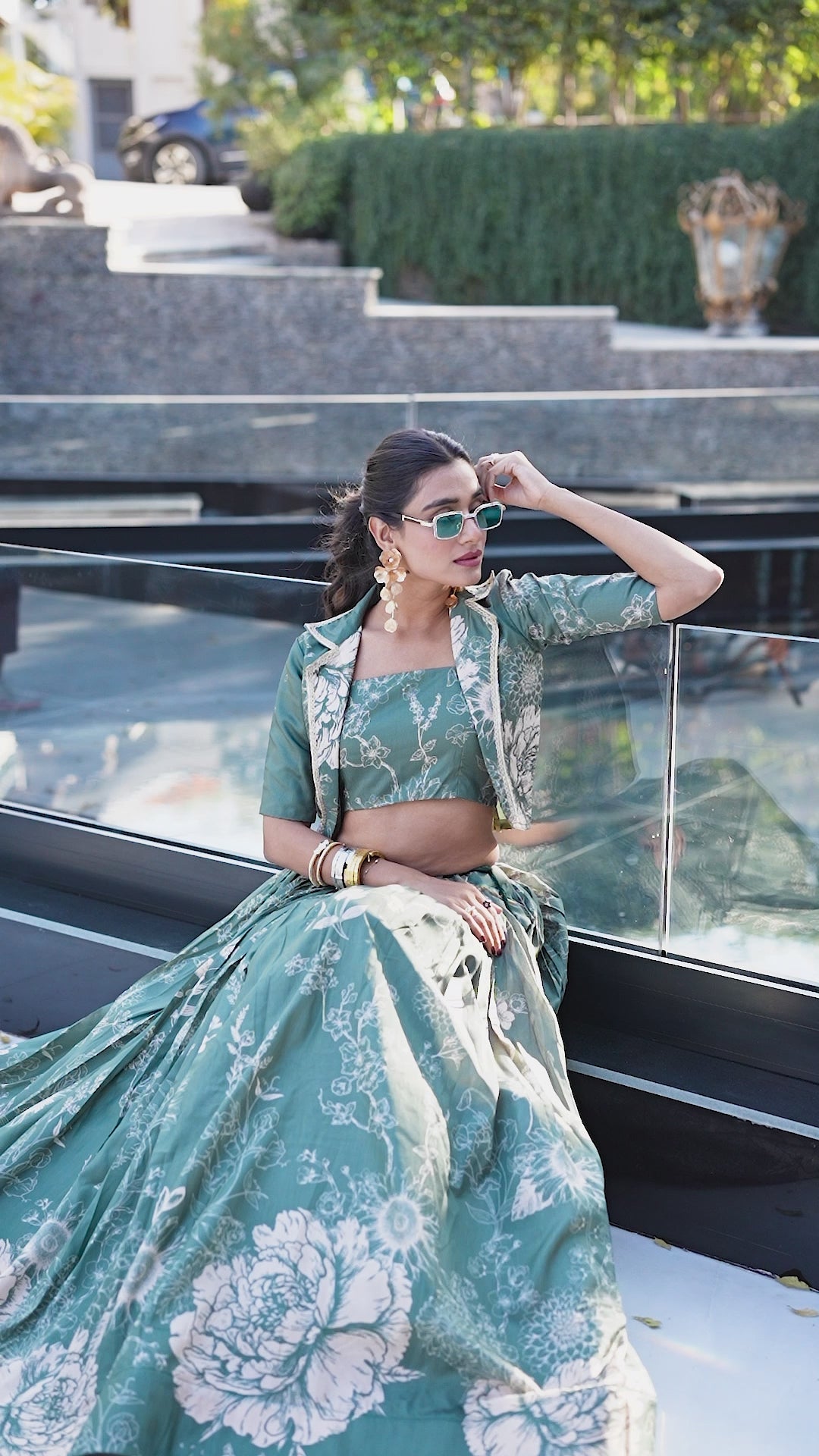 Bottle Green Floral Print Tussar Silk Co-ord Set lehenga Choli