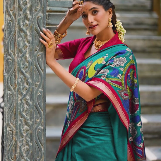 Firozi Color Polyester Viscose Chanderi Kalamkari Print With Zari Weaving Work