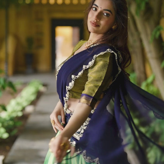 Navy Blue Color Sequince And Thread Embroidery Work Kanchipuram Lehenga Choli
