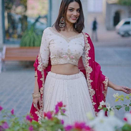 Off white Color Sequins And Thread Embroidery Work Vichitra Silk Lehenga Choli