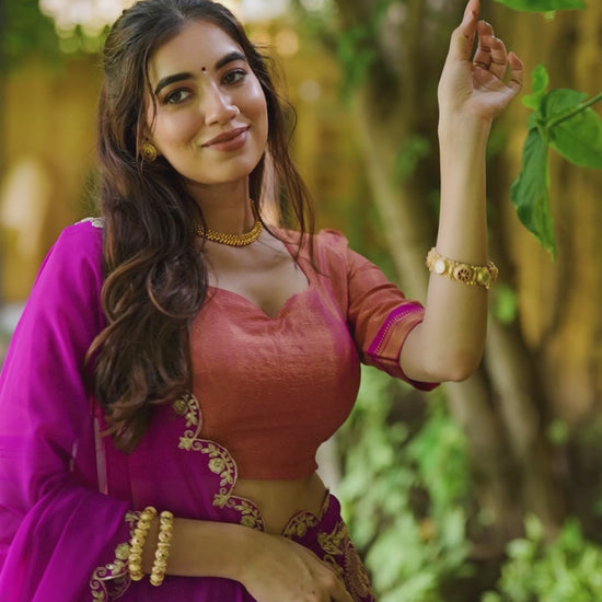 Celebrate your special moments in a Kanchipuram silk lehenga, woven with stunning zari details that add a royal touch to your look. 🦚