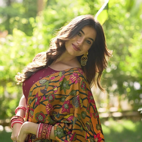 Infuse Your Wardrobe with Southern Grace—Tussar Silk Kalamkari Print Lehenga Choli Featuring a Sophisticated Foil Work Border 🪷