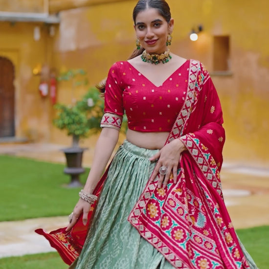 See Green Color Ikkat Patola Printed Tasar Silk Lehenga Choli
