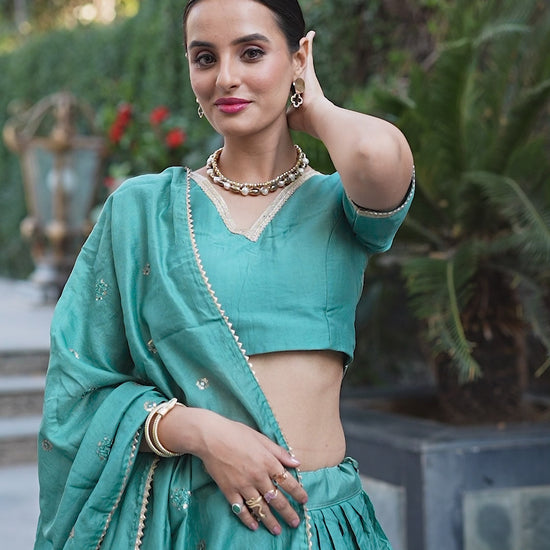 See Green Color Plain With Zari Weaving Work Border Chanderi Wedding Lehenga Choli