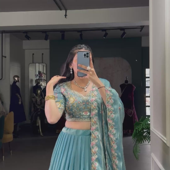 Sky Blue Color Sequince And Thread Embroidery Work Zari Shimmer Lehenga Choli